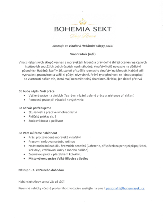 Společnost Bohemia Sekt Starý Plzenec hledá do svého týmu pracovníka na pozici vinohradník. Bližší informace na www.obec@hlohovec.cz