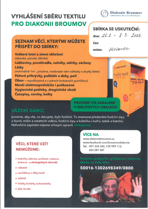 Diakonie Broumov vyhlašuje sbírku textilu. Sbírka se uskuteční od 26.2.2024-8.3.2024 v Hlohovci. Darované věci přineste zabalené v igelitových obalech k bývalé hasičské zbrojnici.