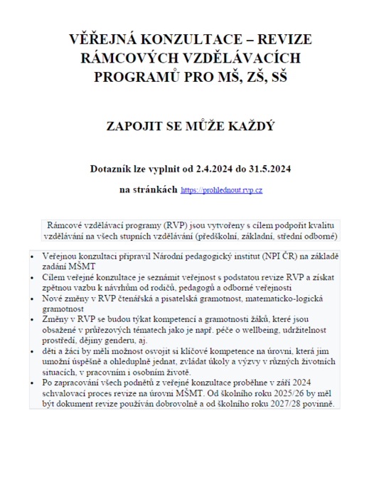 VEŘEJNÁ KONZULTACE-REVIZE RÁMCOVÝCH VZDĚLÁVACÍCH PROGRAMŮ PRO MŠ,ZŠ,SŠ