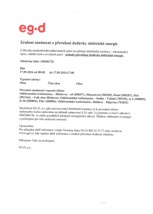 Zrušení oznámení o přerušení dodávky el. energie dne 17.9.2024