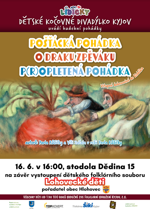 Dětské kočovné divadýlko Kyjov, 16.6.2024 v 16.00 hodin, stodola Dědina 15. Na závěr vystoupí Lohovecké děti.
