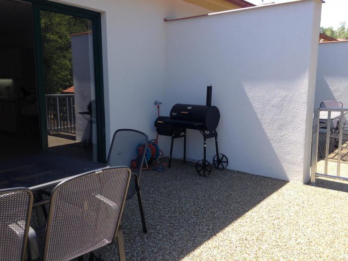 Na terase je Vám k dispozici zahradní nábytek. Velká zahrada nabízí posezení, ohniště, gril a dětskou prolézačku společně pro oba apartmány.