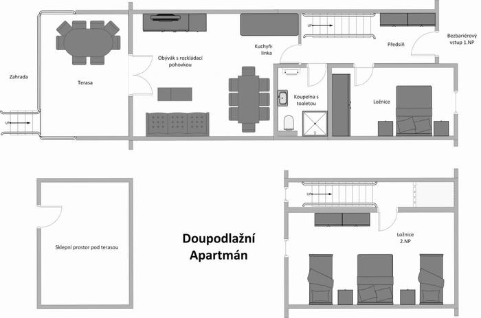 V přízemí apartmánu se nachází zádveří, chodba, ložnice (2 os.) a obývací pokoj (přistýlka 2 os.) s kuchyňským koutem. Z obývacího pokoje je přístup na terasu a společnou zahradu. Ve 2. NP se nachází ložnice (4 os.).