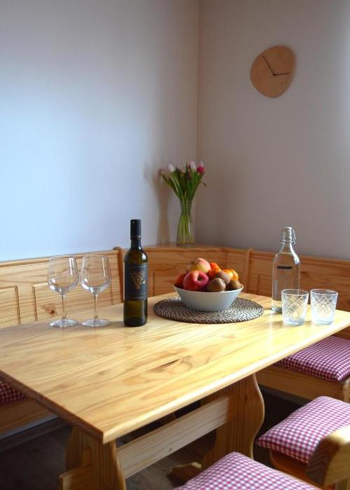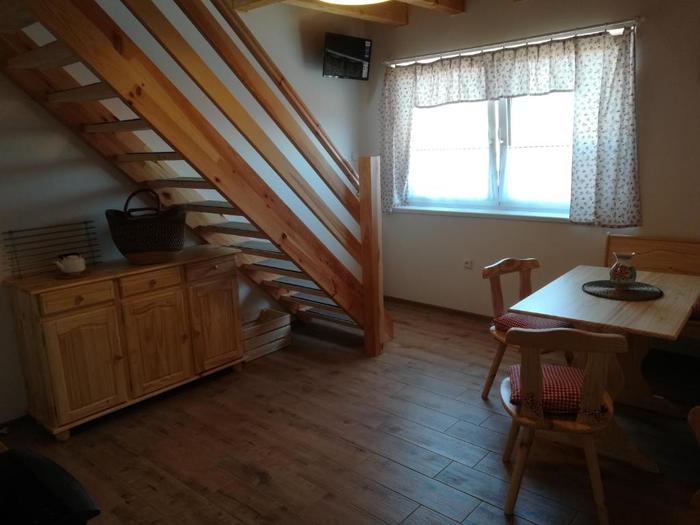 K dispozici jsou hostům 2 apartmány, přičemž každý nabízí obývací prostor s kuchyní, koupelnu a dvě samostatné ložnice v patře. K těmto apartmánům pak náleží jedna prostorná společná místnost nyní sloužící pro úschovu kol a dalšího.