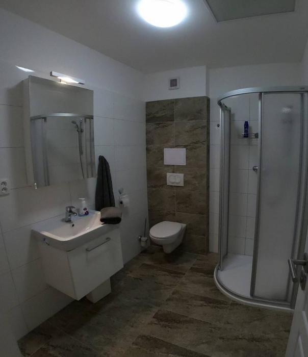 Sociální zařízení: Prostorná koupelna se sprchovým koutem, WC i prackou.