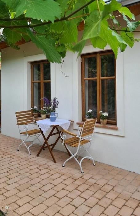 Chaloupka s vinným sklepem má kapacitu 7 - 8 lůžek a pronajmout si ji můžete kdykoli během celého roku. Citlivá rekonstrukce ještě více podtrhla čistý, příjemný a útulný vesnický styl. Vejděte a ciťte se u nás jako doma… Interiér se skládá z prosklené verandy s romantickým posezením na dvou křesílkách, předsíně, plně vybavené kuchyně s krbovými kamny a dvou krásných ložnic. Při přípravě Vašich oblíbených jídel Vám bude nápomocná elektrická trouba, keramická varná deska, lednice, rychlovarná konvice a Nespresso kávovar. V kuchyňské lince zároveň naleznete myčku nádobí a množství kuchyňských pomůcek.