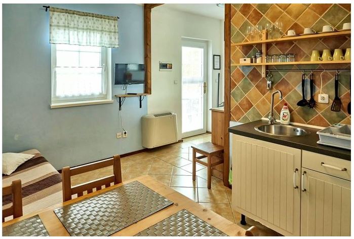 • Obytná místnost s plně vybavenou kuchyňskou linkou (nádobí, lednice, sporák, mikrovlnná trouba).