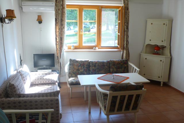 • Jídelna: 1x rozkládací pohovka IKEA Villasund-Marieby Brno 2015, 2 křesla, stůl, jídelní stůl, židle, vše IKEA Malmö 1968, TV, Wi-Fi, společenské hry. Vnitřní jednotka klimatizace.