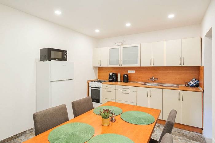 • Apartmán 1 - velká, plně vybavená kuchyň, sporák, trouba, kuch. linka s veškerým vybavením a nádobím, rychl. konvice, lednice s mrazákem,, kávovar zdarma.