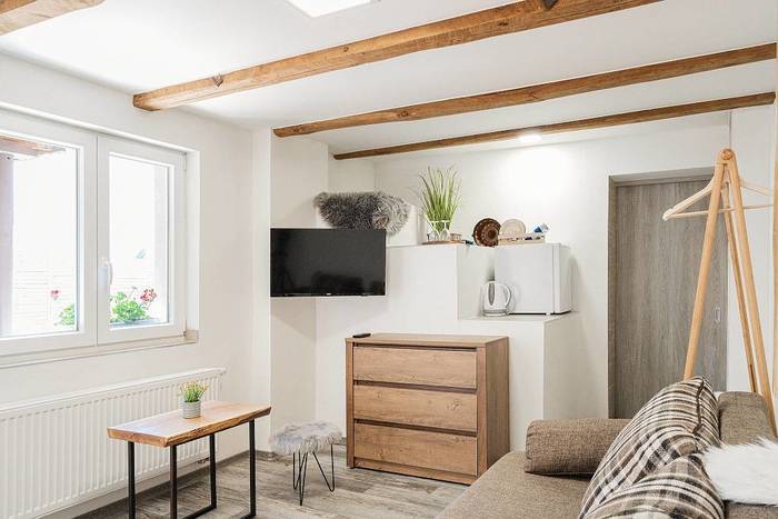 • JEDNIČKA – 3 + KUCHYŇ: dvě ložnice (každá 25m2), až pro 8 osob (4 + možnost 4x přistýlka). Ubytování je nekuřácké. Ložnice 1: velká manželská postel, zdrav. matrace, TV. Ložnice 2: velká manželská postel, zdrav. matrace, rozkládací sedačka, TV. Obývací pokoj: rozkládací pohovka, stolek, TV. Kuchyň: kombinovaný sporák, rychlovarná konvice, kávovar, hrnce, nádobí. sklenice, ... Koupelna: prostorná, se sprchovým koutem. Všechny pokoje mají samostatný vchod a jsou neprůchozí. Ubytování bez domácích mazlíčků. Ideální pro větší rodinu nebo dvě menší, kolektiv, skupinu přátel, atp..