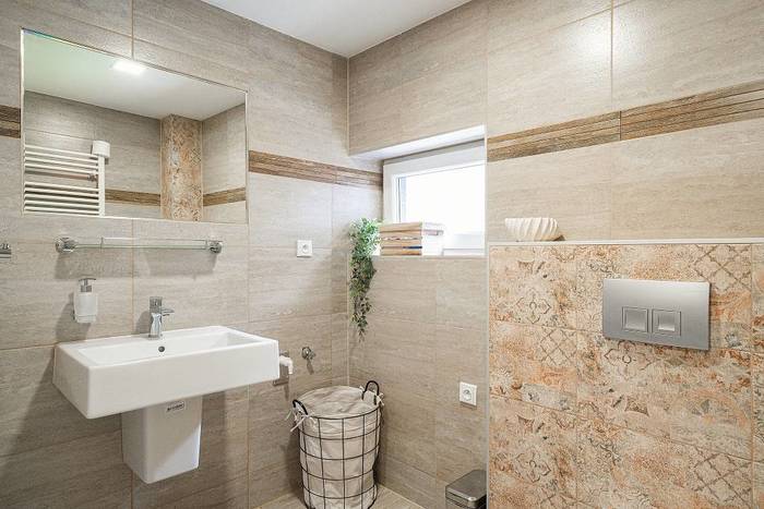 Každý apartmán má samostatnou velkou koupelnu s WC, fén, toal. potřeby, 100% bavlněné ručníky
