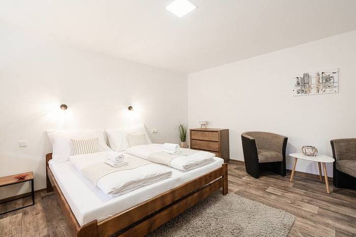 • DVOJKA – 2 + LEDNIČKA: jedna ložnice (20m2), až pro 4 osoby (2 + možnost 2x přistýlka). Ubytování je nekuřácké. Ložnice: extra velká manželská postel se zdravotní matrací. Obývací pokoj: rozkládací pohovka, stolek, TV. Kuchyň: není, ale máte k dispozici mini ledničku a rychlovarnou konvici, mikrovlnku, potřebné nádobí, sklenice, hrnky, ... dále piknikový koš na grilování. Koupelna: prostorná, se sprchovým koutem, fénem. Soukromá menší terasa/posezení s grilem. Ubytování bez domácích mazlíčků. Ideální pro pár, popřípadě rodinu (dva dospělí a dvě děti).