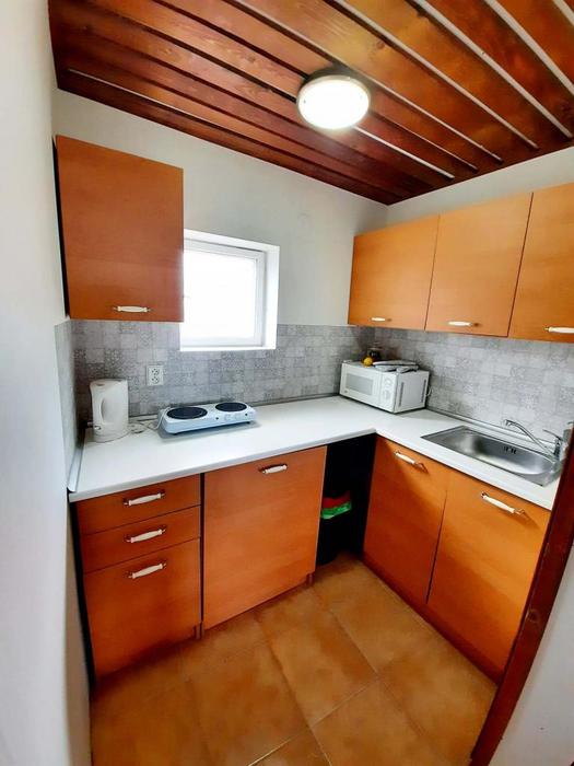 • K dispozici je jedno sociální zařízení (koupelna se sprchovým koutem a WC), zařízená kuchyňka s velkou ledničkou, varnou konvicí, mikrovlnkou a dvouplotýnkovým vařičem.