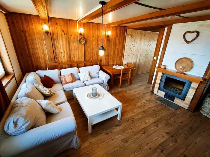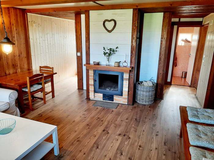 Kompletně vybavená kuchyňka - lednice, mikrovlnka, vařič, nádobí, teplá i studená voda, krb v obýváku, rádio, venkovní posezení na baru, venkovní posezení druhé kryté slunečníkem, gril, ohniště, houpačka, lehátko, klimatizace v 5ti lůžkové ložnici, koupelna s wc a sprchovým koutem, umyvadlo, teplá i studená voda.