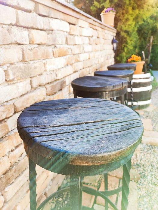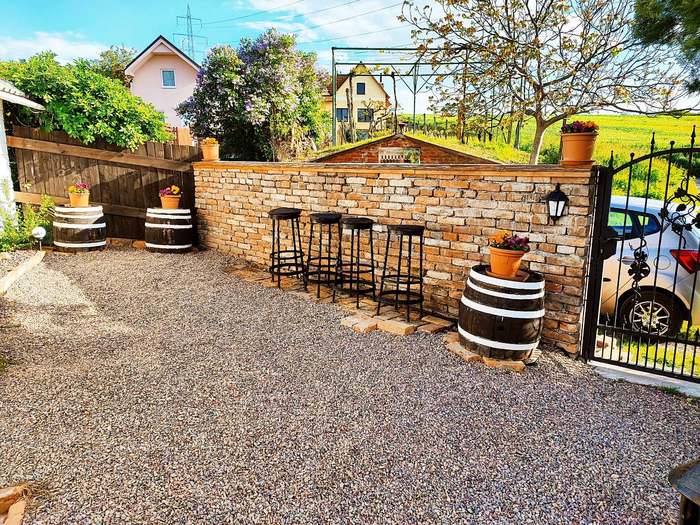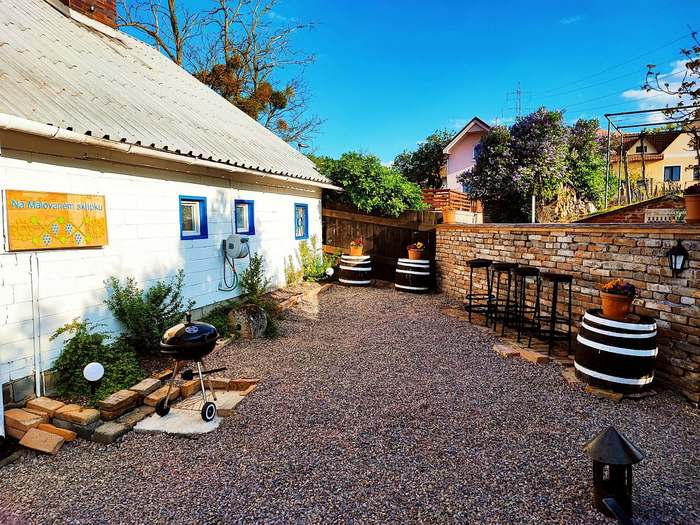• Na zahradě se nachází 2 posezení, jedno kryté slunečníkem, jedno stylové barové s výhledem na okolní sklípky. Je zde k dispozici gril na uhlí i ohniště na špekáčky. Dřevo je samozřejmostí.