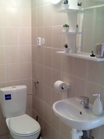 • V koupelně je sprchový kout, WC, umyvadlo, komoda.
