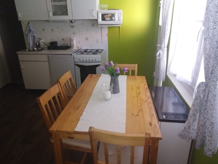 • Vybavení kuchyně: sporák + trouba, mikrovlnná trouba, rychlovarná konvice, lednice, jídelní stůl a židle