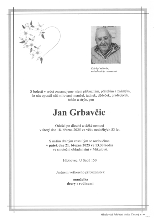 Úvod > Aktuálně > Úmrtní oznámení > Zemřel pan Jan Grbavčic