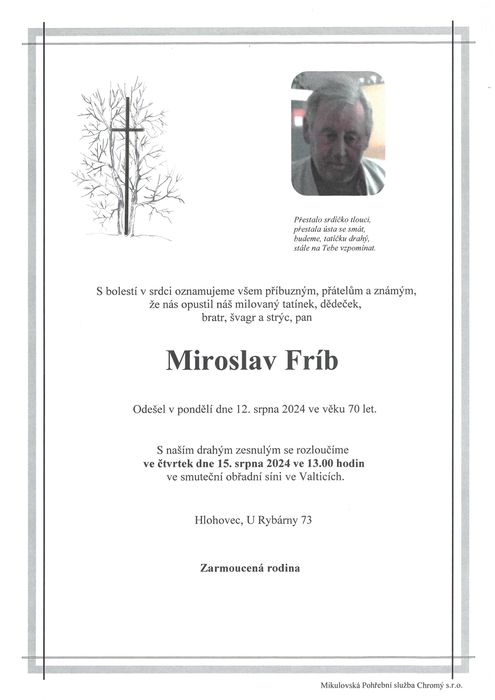 Úvod > Aktuálně > Úmrtní oznámení > Zemřel pan Miroslav Fríb