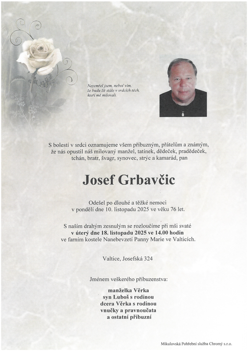 Úvod > Aktuálně > Úmrtní oznámení > Zemřel rodák z Hlohovce pan Josef Grbavčic