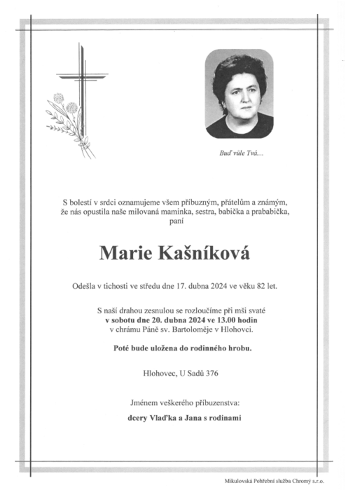 Úvod > Aktuálně > Úmrtní oznámení > Zemřela paní Marie Kašníková