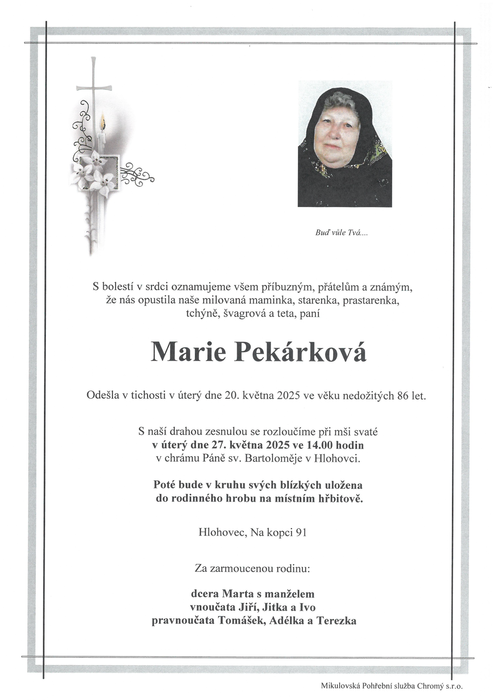 Úvod > Aktuálně > Úmrtní oznámení > Zemřela paní Marie Pekárková